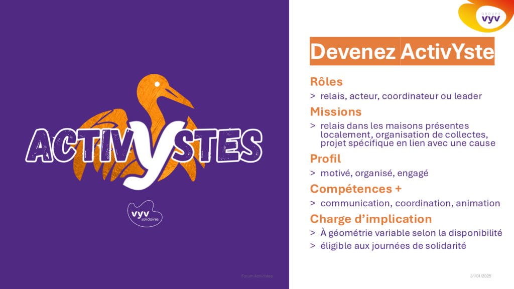 | Relais | En tant que relais, l’activYste restera à l’écoute des actions partagées au sein de la communauté. Il s’attachera à partager sur les réseaux de communication internes de son site/maison (intranet, sharepoint, Yammer, mail…) les éléments de communication mis à disposition par VYV Solidaires. Il pourra également poser des affiches, distribuer des flyers, remplacer son fond Teams pour le mettre aux couleurs de l’évènement… bref, tout ce qui peut favoriser la communication autour de l’évènement et la mobilisation. Il parlera évidemment de l’évènement à ses collègues. Il pourra enfin relayer les post LinkedIn de VYV Solidaires ou d’ailleurs. |