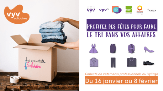 Le saviez-vous ? Le mois de janvier de VYV Solidaires est tournée vers la jeunesse. Après le lancement de la campagne de mentorat avec NQT, nous avons pensé utile d'organiser une collecte de vêtements professionnels avec La Cravate Solidaire qui se tiendra au Vyllage du 16 janvier au 8 février....