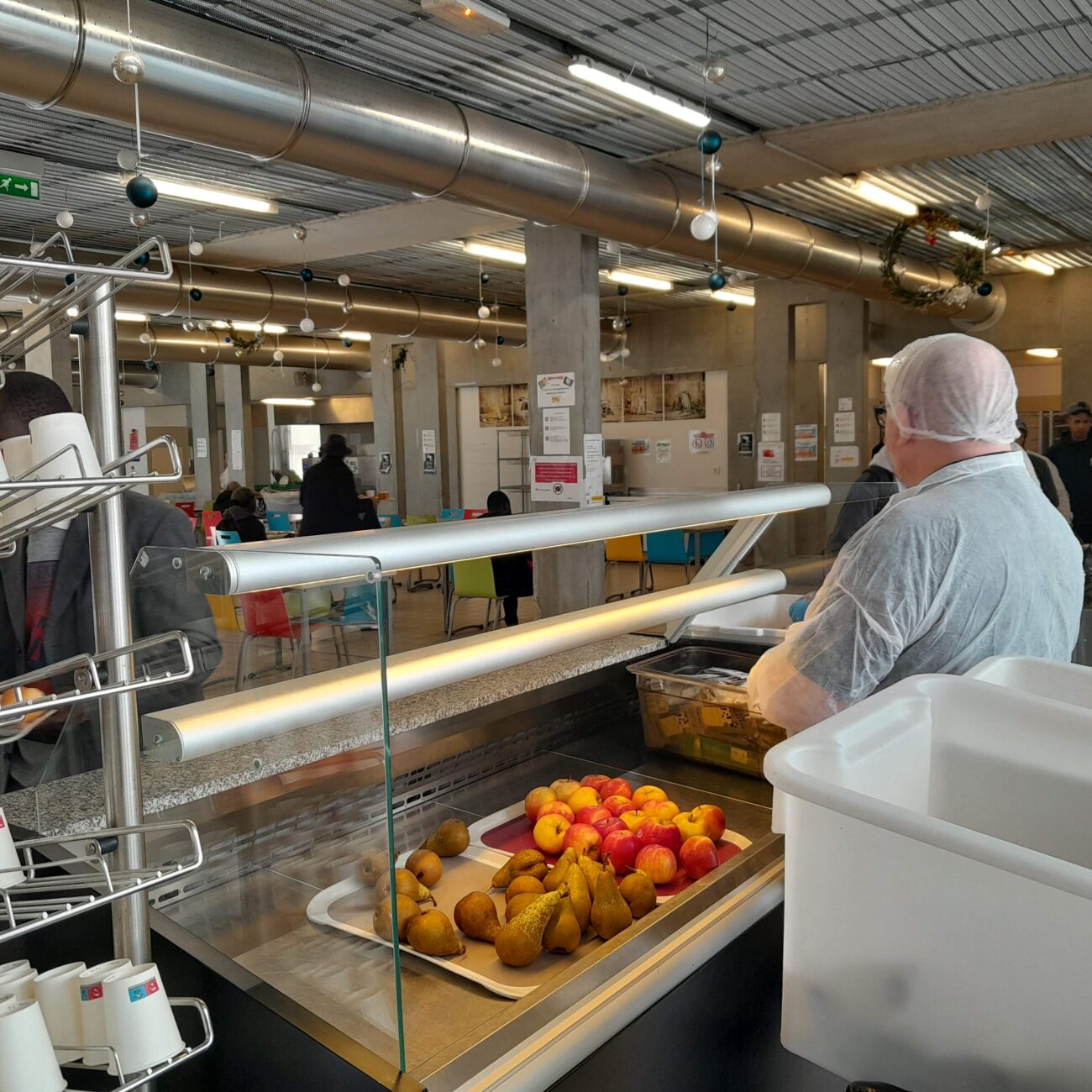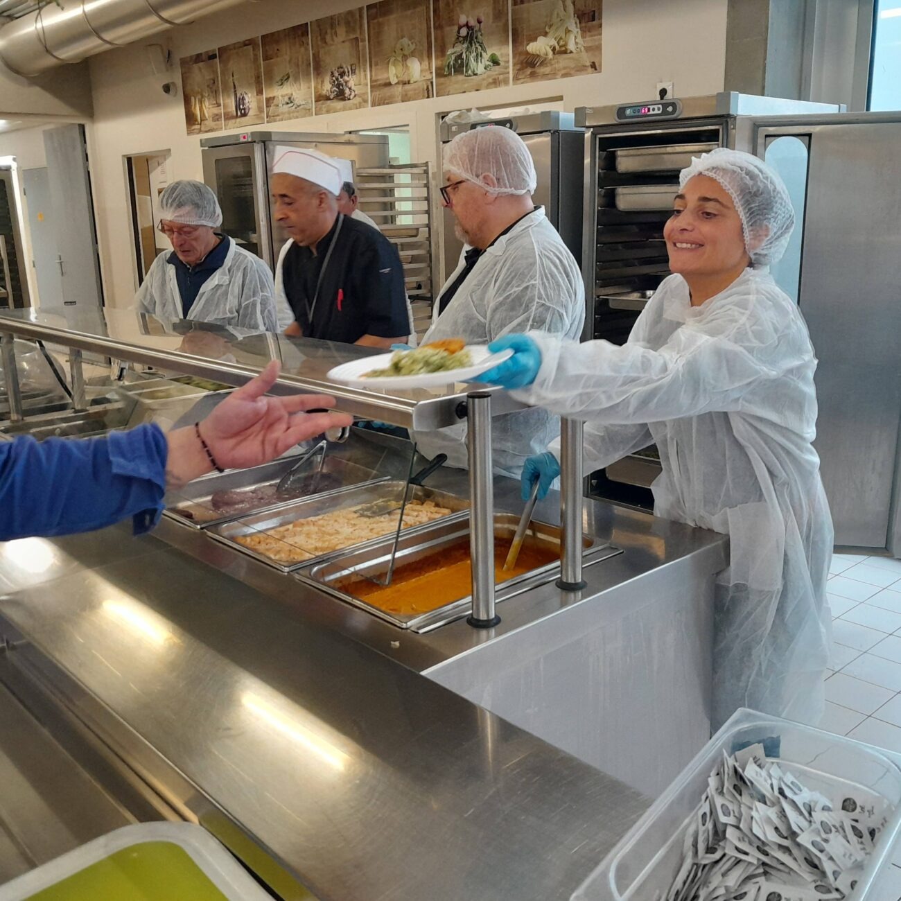 Après une présentation et une visite des lieux, nous avons rencontré l’équipe de bénévoles et nous sommes répartis les rôles. J’ai, pour ma part, eu l’opportunité d’accueillir et de guider les personnes en fauteuil roulant, ainsi que de servir viandes, poissons, sauces, café et thé.