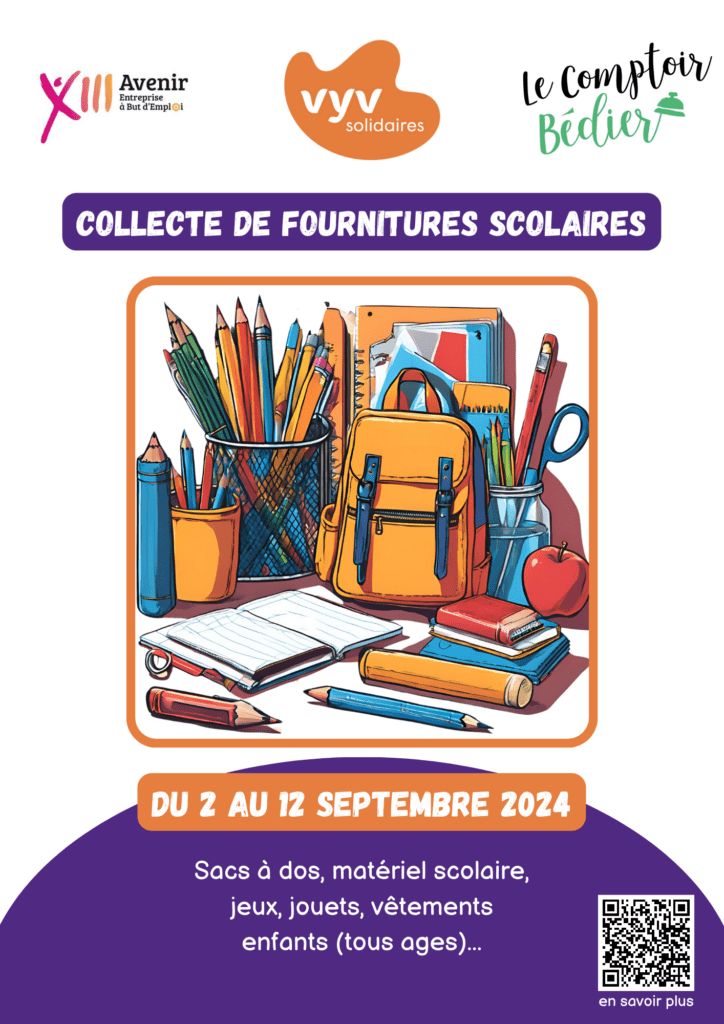 Sacs à dos, matériel scolaire, jeux, jouets, vêtements enfants (tous ages), nous collectons au Vyllage tous les articles utiles aux élèves du quartier.