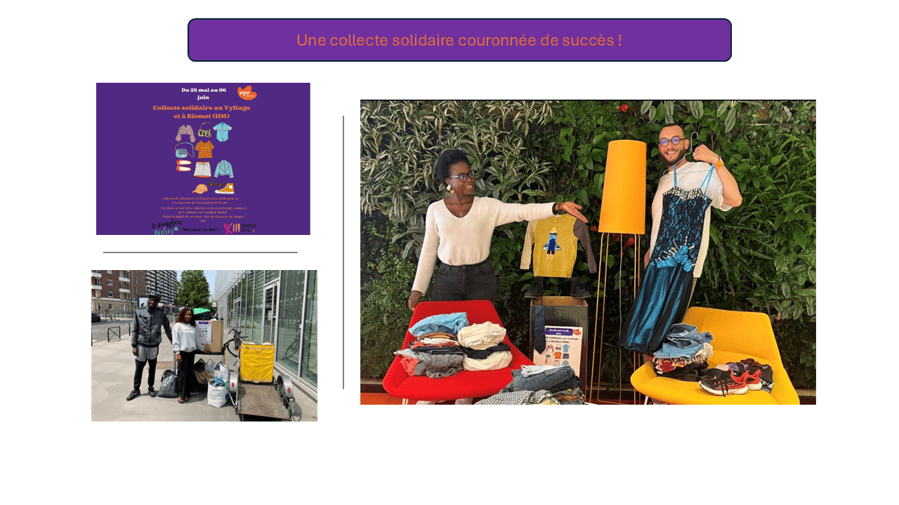 Du 26 mai au 06 Juin derniers, s’est tenu au Vyllage et dans les locaux d’Harmonie Mutuelle (Blomet) une collecte de vêtements et d’accessoires. Cette initiative visait à collecter des dons au profit de la ressourcerie Le comptoir de Bédier de l’association 13 avenir.
